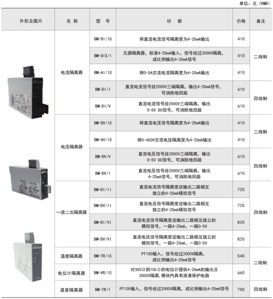 BM系列模擬信號隔離器可以對電流、電壓等電量參數或溫度、電阻等非電量參數進行高速精確測量,經隔離轉換成標準的模擬信號輸出。既可直接與指針表、數顯表相接,也可以與自控儀表(如PLC)、各種A/D轉換器以及計算機系統配接。